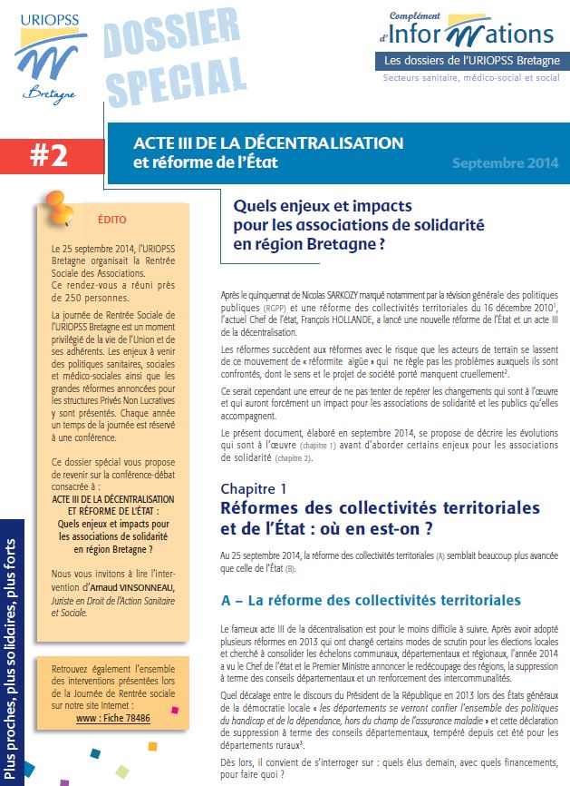 L'URIOPSS Bretagne publie un Dossier spécial d’informations retraçant la Journée de Rentrée Sociale des Associations 2014 consacrée au thème suivant : « Acte III de la décentralisation et Réforme de l’Etat : quels enjeux et ...